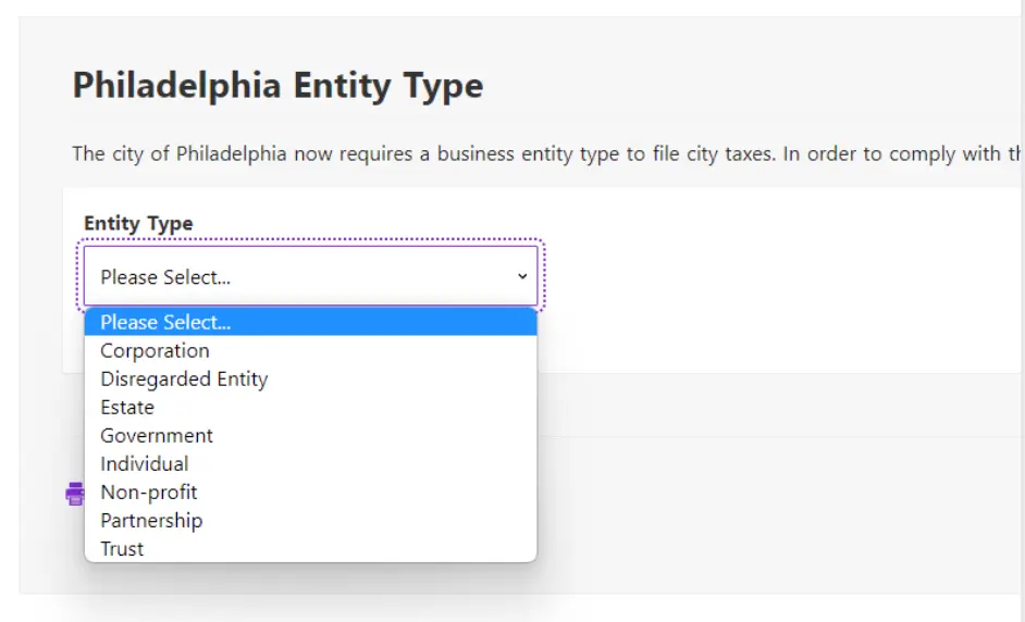 Beginning in 2022, the city of Philadelphia requires the user to select an Entity Type. Employers are required to file with Philadelphia if wages are paid to either:
