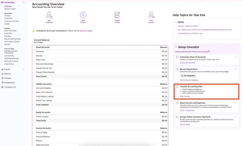Transfering your accounting data is one of the steps in getting started with accounting. See our help article, “Getting Started with Accounting,” for more steps for setup success.
