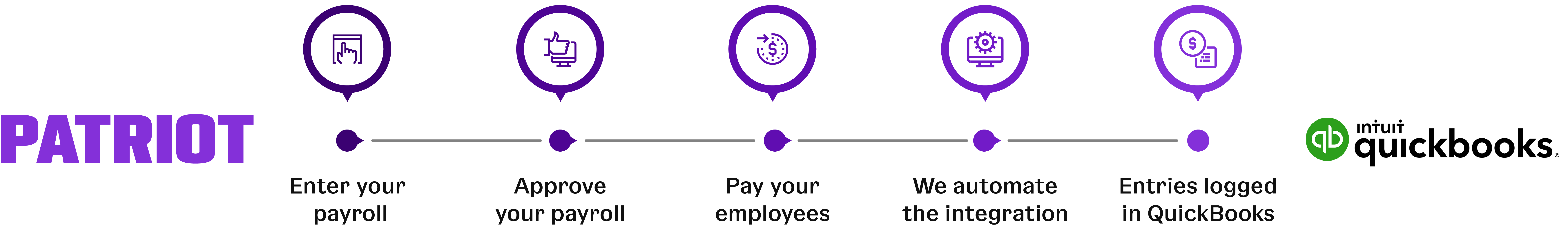 Payroll information is imported seamlessly to Patriot's Accounting software. We also integrate with QuickBooks Desktop or QuickBooks Online.