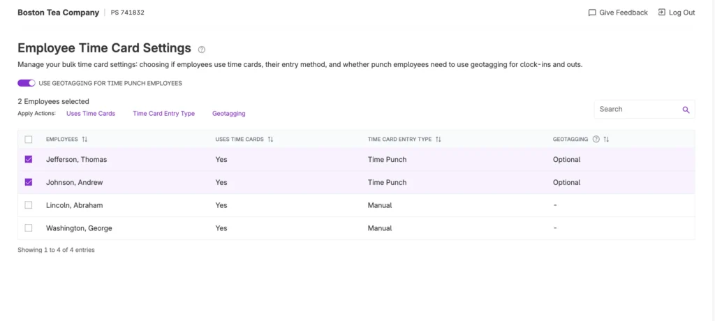 One page. Total control. Use the Employee Time Card Settings page to enable geotagging, set up time card entry, and manage preferences for your whole team—all in one place.