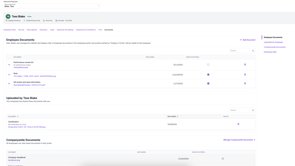 Managing employee documents used to mean piecing together files from email, texts, and the occasional paper form someone handed you at the wrong moment. Now, every document tied to an employee lives in one place. Documents you’ve uploaded for them. Documents they’ve uploaded for you. All organized, all accessible on the employee document tab. The company contact will be notified by email when a file is shared by an employee.